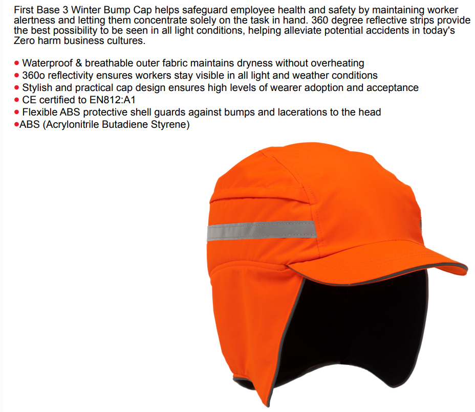 3M™ First Base™ 3 Bump Cap Winter in high visibility orange provides head protection to EN812:A1. It combines a patented ergonomic ABS shell with over-ear fabric panels and a waterproof, breathable outer fabric.